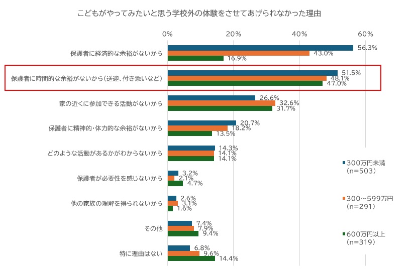 『子どもの「体験格差」実態調査』※2によると、保護者がこどもの体験活動を諦めた理由として「保護者に時間的余裕がない」が経済的理由と同程度に多く挙げられています。